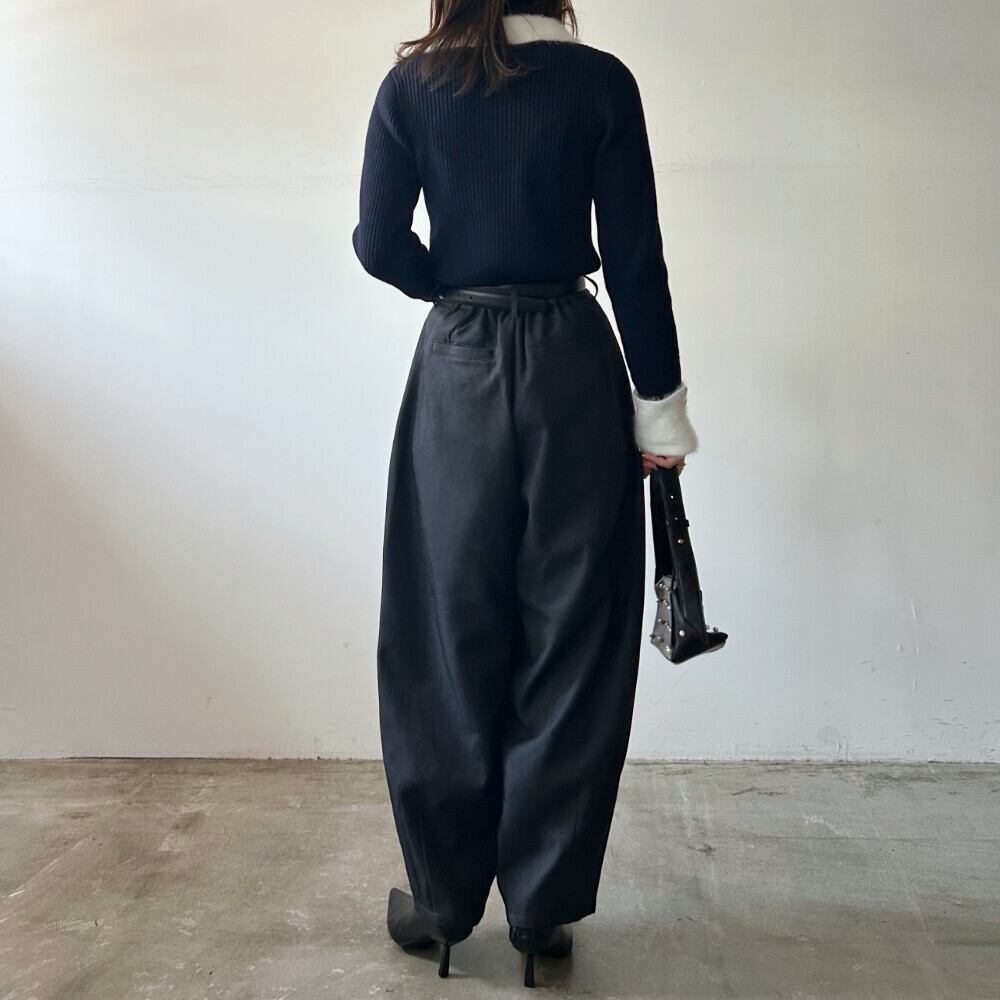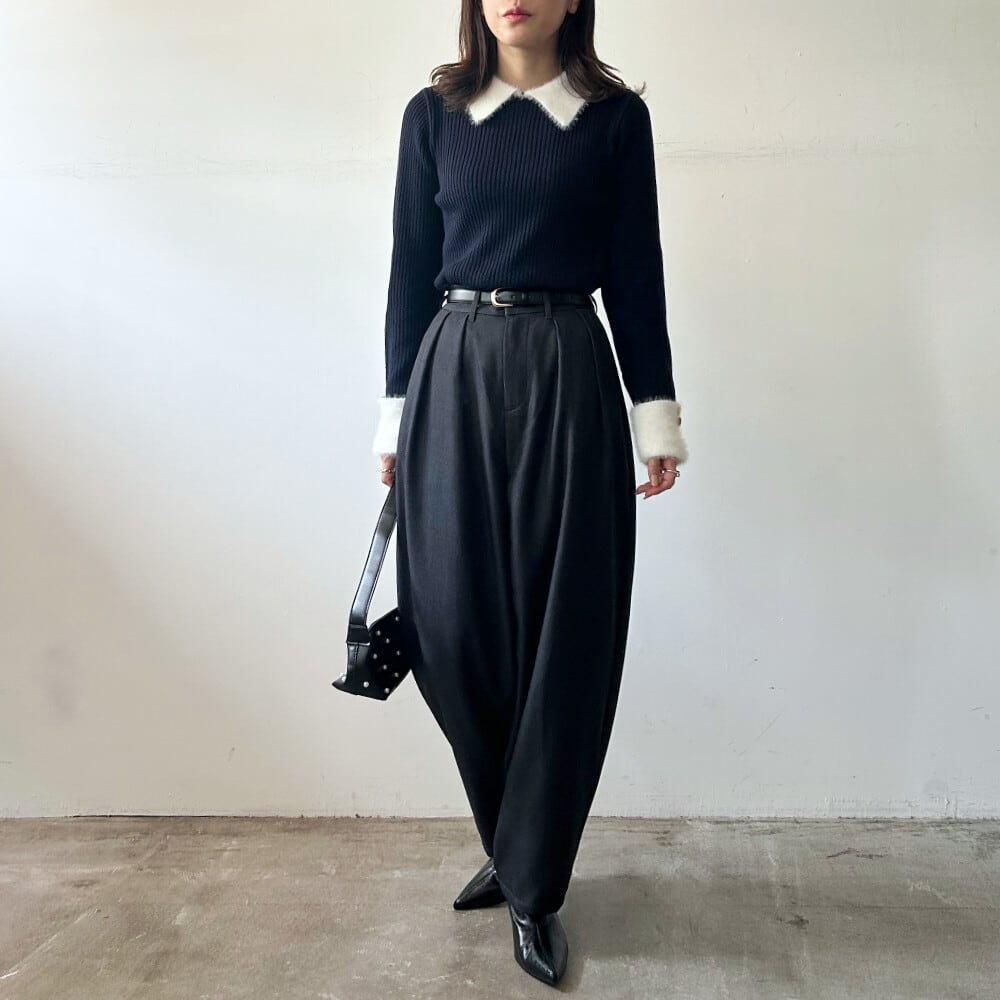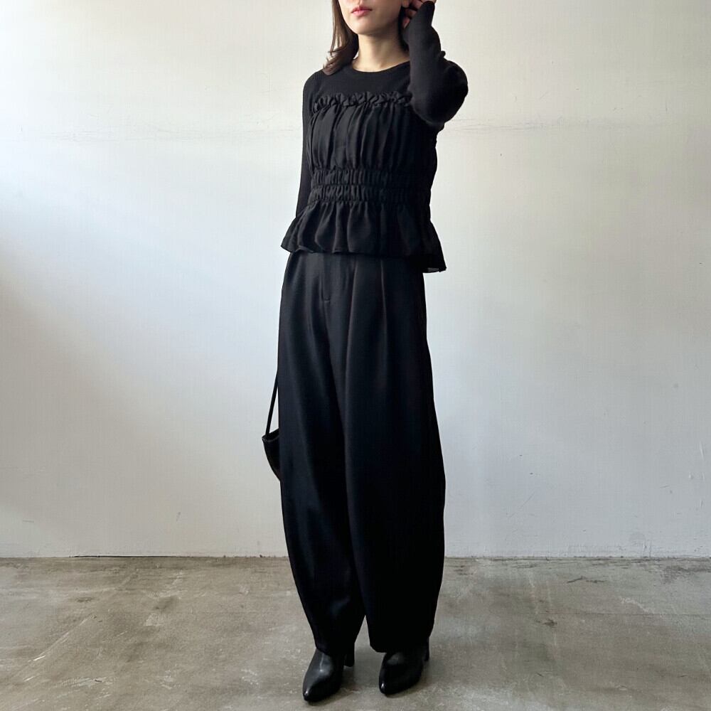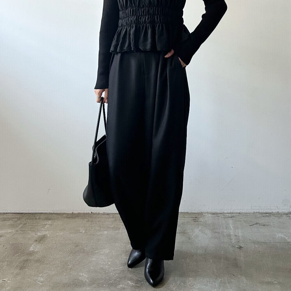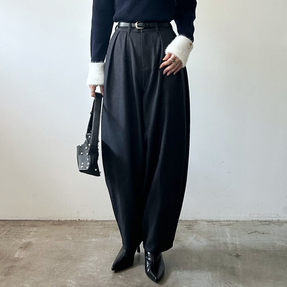 ゆったりとしたタック入りのバルーンシルエットで体型をカバーしつつ、足元はすっきりとしたデザインに。