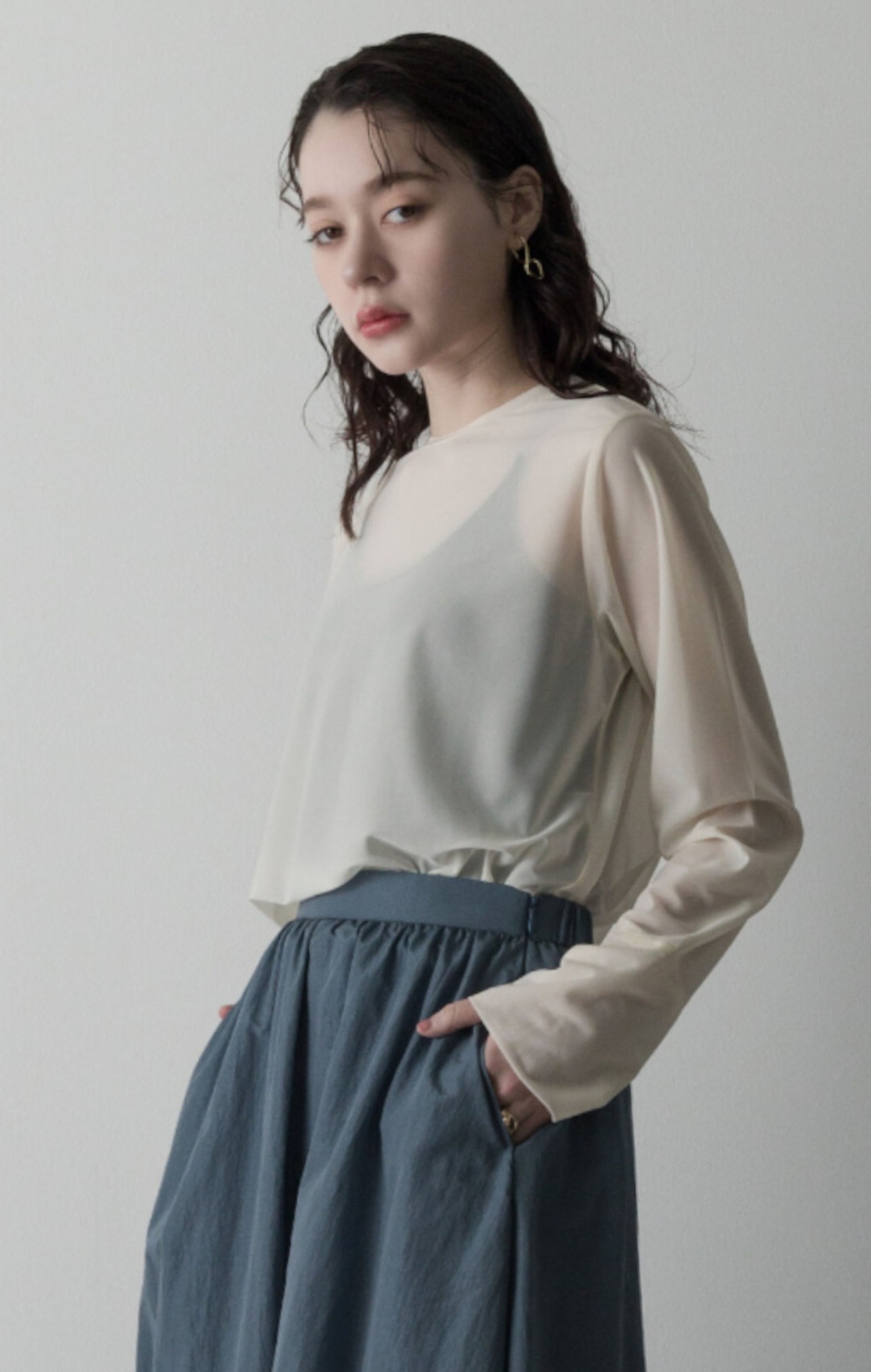トレンドのシアトップスを着用しすやすいようにカットソー素材でつくりました。どんなスタイリングにも取り入れられる優秀トップスはレイヤードしても単品でコーディネートしても今らしさを演出してくれます。通常の素材よりも伸縮性があるので着心地も抜群です。カラーは定番のアイボリー、ブラックとアッシュブルー。どのカラーも重宝するので色違いで手に入れて。